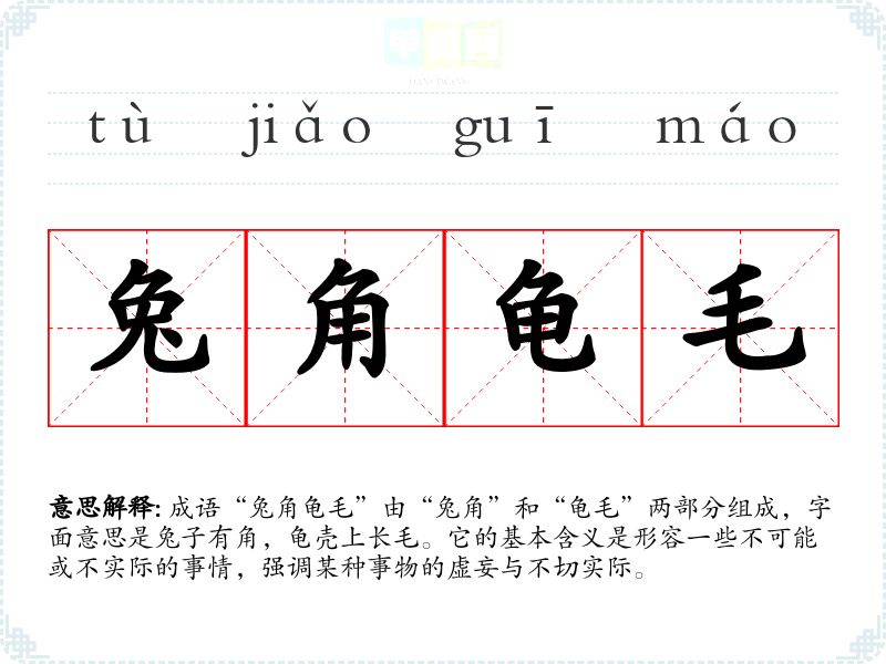 成语“兔角龟毛”由“兔角”和“龟毛”两部分组成,字面意思是兔子有角,龟壳上长毛。它的基本含义是形容一些不可能或不实际的事情,强调某种事物的虚妄与不切实际。