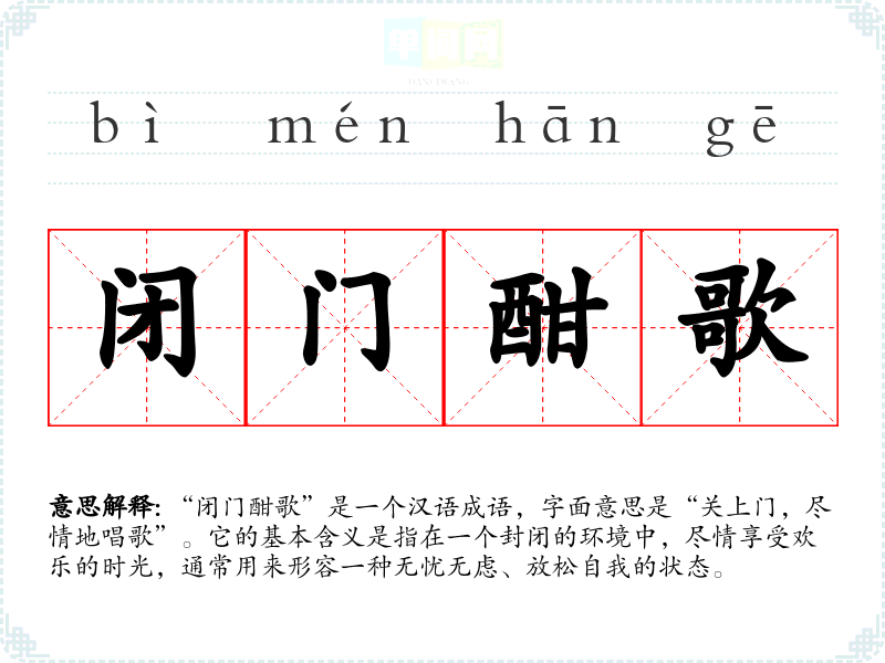 “闭门酣歌”是一个汉语成语,字面意思是“关上门,尽情地唱歌”。它的基本含义是指在一个封闭的环境中,尽情享受欢乐的时光,通常用来形容一种无忧无虑、放松自我的状态。