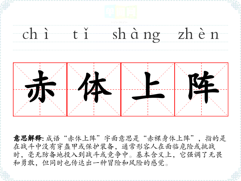 成语“赤体上阵”字面意思是“赤裸身体上阵”,指的是在战斗中没有穿盔甲或保护装备,通常形容人在面临危险或挑战时,毫无防备地投入到战斗或竞争中。基本含义上,它强调了无畏和勇敢,但同时也传达出一种冒险和风险的感觉。