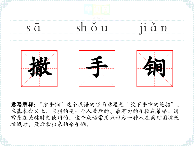 “撒手锏”这个成语的字面意思是“放下手中的绝招”。在基本含义上,它指的是一个人最后的、最有力的手段或策略,通常是在关键时刻使用的。这个成语常用来形容一种人在面对困境或挑战时,最后拿出来的杀手锏。