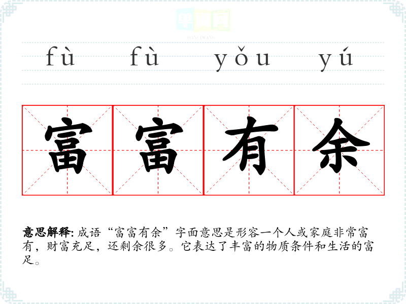 成语“富富有余”字面意思是形容一个人或家庭非常富有,财富充足,还剩余很多。它表达了丰富的物质条件和生活的富足。