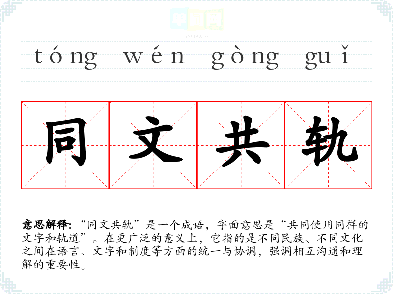 “同文共轨”是一个成语,字面意思是“共同使用同样的文字和轨道”。在更广泛的意义上,它指的是不同民族、不同文化之间在语言、文字和制度等方面的统一与协调,强调相互沟通和理解的重要性。