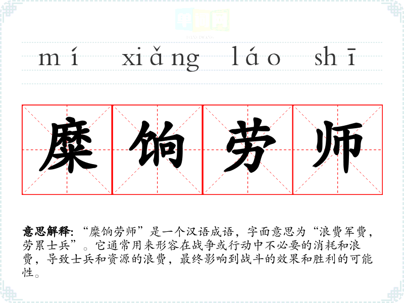 “糜饷劳师”是一个汉语成语,字面意思为“浪费军费,劳累士兵”。它通常用来形容在战争或行动中不必要的消耗和浪费,导致士兵和资源的浪费,最终影响到战斗的效果和胜利的可能性。
