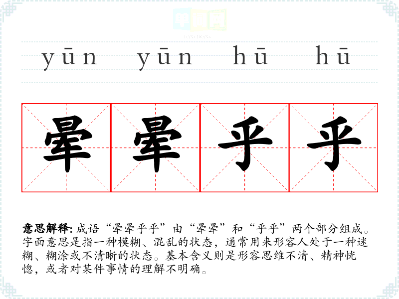 成语“晕晕乎乎”由“晕晕”和“乎乎”两个部分组成。字面意思是指一种模糊、混乱的状态,通常用来形容人处于一种迷糊、糊涂或不清晰的状态。基本含义则是形容思维不清、精神恍惚,或者对某件事情的理解不明确。