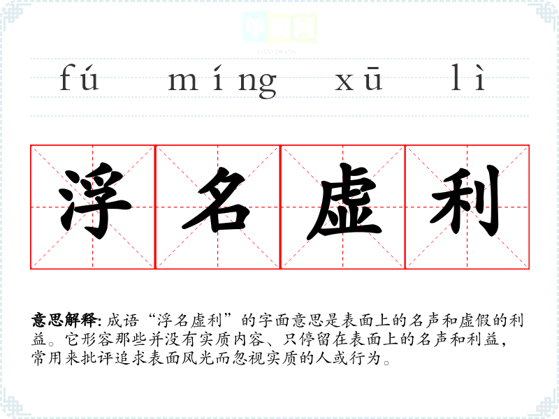 成语“浮名虚利”的字面意思是表面上的名声和虚假的利益。它形容那些并没有实质内容、只停留在表面上的名声和利益,常用来批评追求表面风光而忽视实质的人或行为。