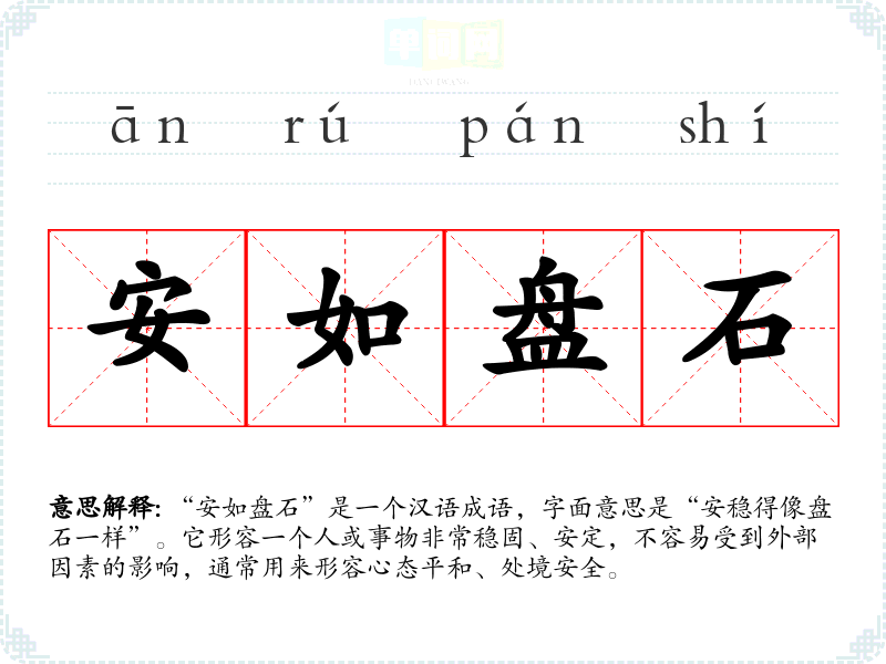 “安如盘石”是一个汉语成语,字面意思是“安稳得像盘石一样”。它形容一个人或事物非常稳固、安定,不容易受到外部因素的影响,通常用来形容心态平和、处境安全。