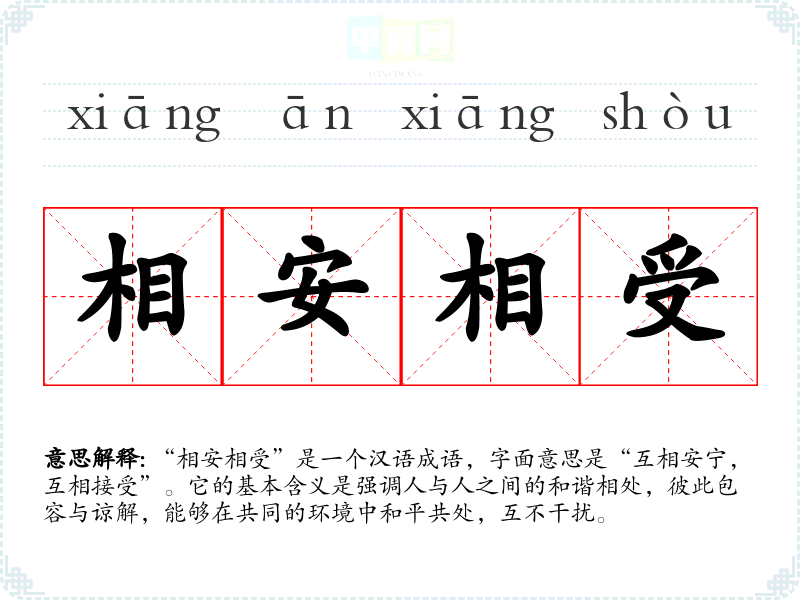 “相安相受”是一个汉语成语,字面意思是“互相安宁,互相接受”。它的基本含义是强调人与人之间的和谐相处,彼此包容与谅解,能够在共同的环境中和平共处,互不干扰。