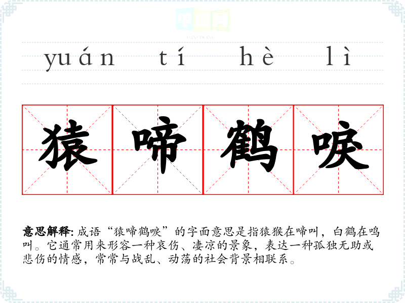 - 同义成语:孤苦伶仃、凄风苦雨,均表达孤独和悲伤的情感,但“猿啼鹤唳”更强调自然界的声音与人心的共鸣。
