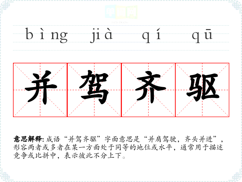 成语“并驾齐驱”字面意思是“并肩驾驶,齐头并进”,形容两者或多者在某一方面处于同等的地位或水平,通常用于描述竞争或比拼中,表示彼此不分上下。