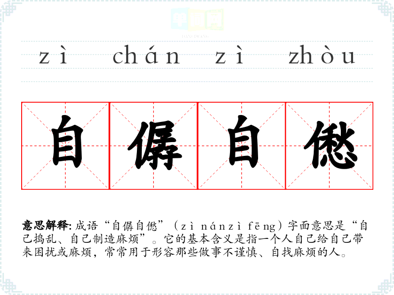 成语“自僝自僽”(zì nán zì fēng)字面意思是“自己捣乱、自己制造麻烦”。它的基本含义是指一个人自己给自己带来困扰或麻烦,常常用于形容那些做事不谨慎、自找麻烦的人。