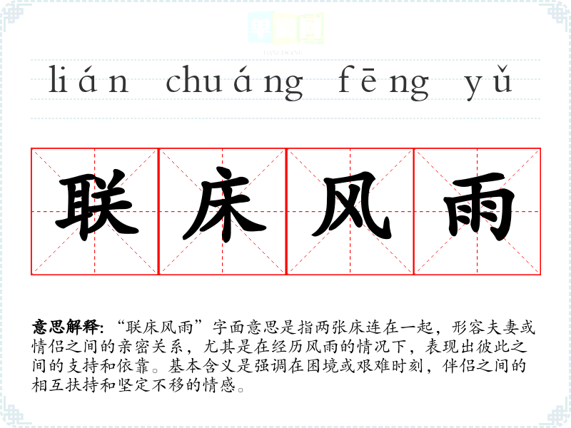 “联床风雨”字面意思是指两张床连在一起,形容夫妻或情侣之间的亲密关系,尤其是在经历风雨的情况下,表现出彼此之间的支持和依靠。基本含义是强调在困境或艰难时刻,伴侣之间的相互扶持和坚定不移的情感。