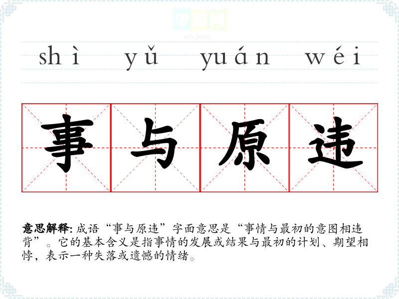 成语“事与原违”字面意思是“事情与最初的意图相违背”。它的基本含义是指事情的发展或结果与最初的计划、期望相悖,表示一种失落或遗憾的情绪。