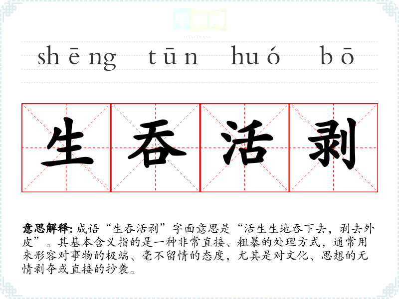 成语“生吞活剥”字面意思是“活生生地吞下去,剥去外皮”。其基本含义指的是一种非常直接、粗暴的处理方式,通常用来形容对事物的极端、毫不留情的态度,尤其是对文化、思想的无情剥夺或直接的抄袭。