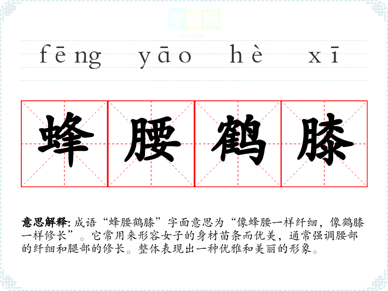 成语“蜂腰鹤膝”字面意思为“像蜂腰一样纤细,像鹤膝一样修长”。它常用来形容女子的身材苗条而优美,通常强调腰部的纤细和腿部的修长。整体表现出一种优雅和美丽的形象。