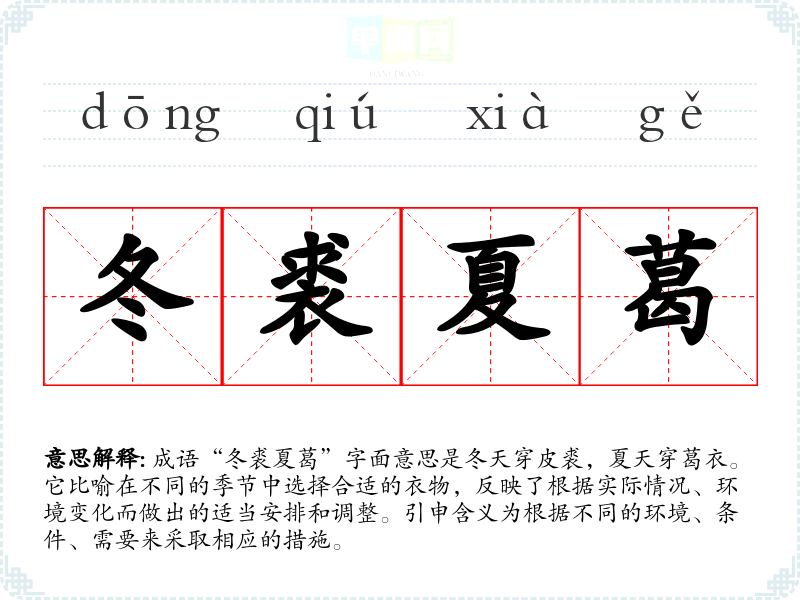 成语“冬裘夏葛”字面意思是冬天穿皮裘,夏天穿葛衣。它比喻在不同的季节中选择合适的衣物,反映了根据实际情况、环境变化而做出的适当安排和调整。引申含义为根据不同的环境、条件、需要来采取相应的措施。