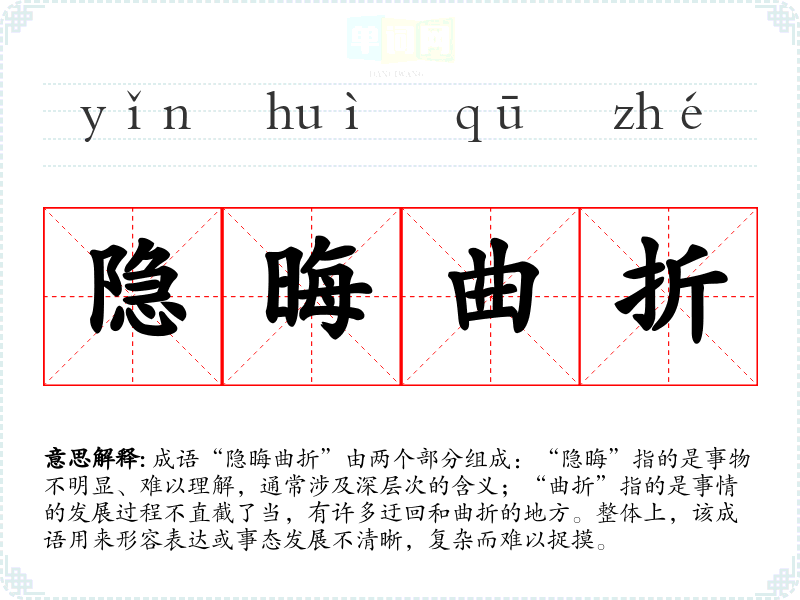 成语“隐晦曲折”由两个部分组成:“隐晦”指的是事物不明显、难以理解,通常涉及深层次的含义;“曲折”指的是事情的发展过程不直截了当,有许多迂回和曲折的地方。整体上,该成语用来形容表达或事态发展不清晰,复杂而难以捉摸。