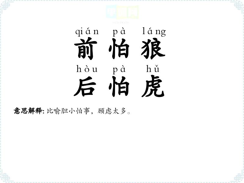 | 前怕狼,后怕虎 | 比喻胆小怕事,顾虑太多。 |