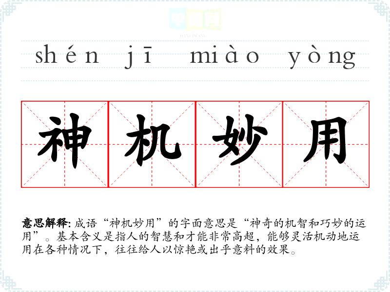 成语“神机妙用”的字面意思是“神奇的机智和巧妙的运用”。基本含义是指人的智慧和才能非常高超,能够灵活机动地运用在各种情况下,往往给人以惊艳或出乎意料的效果。