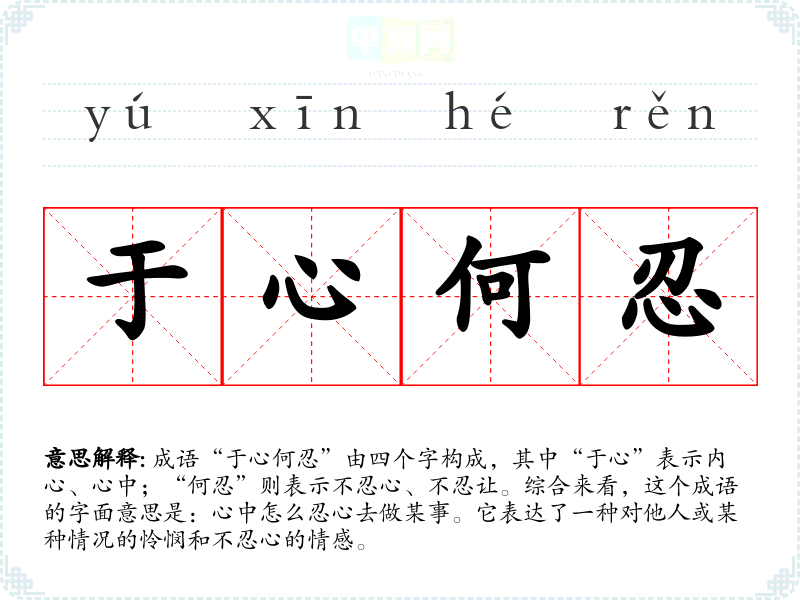 | 于心何忍 | 怎能忍心。即内心不忍。 |