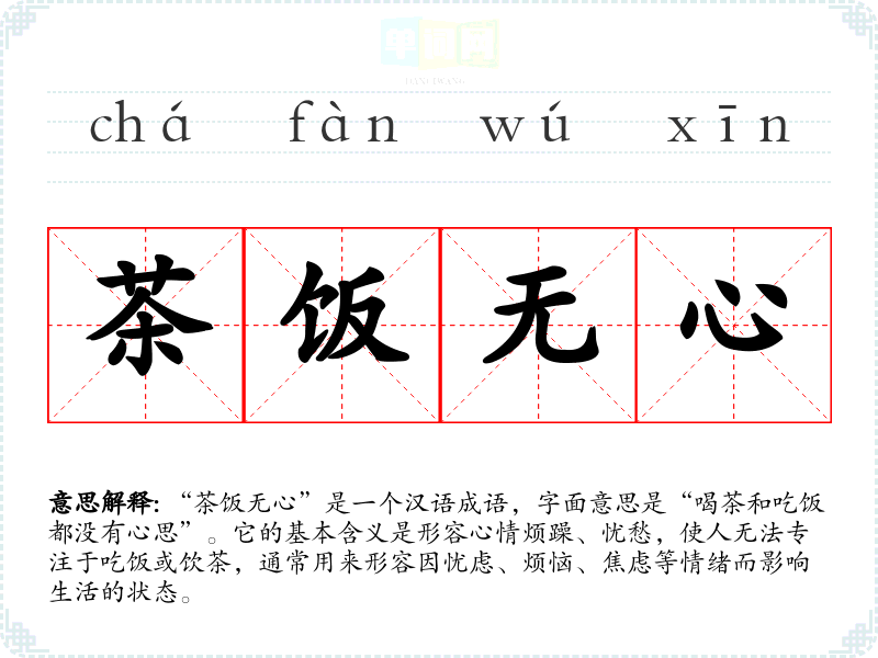 “茶饭无心”是一个汉语成语,字面意思是“喝茶和吃饭都没有心思”。它的基本含义是形容心情烦躁、忧愁,使人无法专注于吃饭或饮茶,通常用来形容因忧虑、烦恼、焦虑等情绪而影响生活的状态。