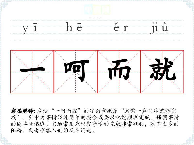 成语“一呵而就”的字面意思是“只需一声呵斥就能完成”,引申为事情经过简单的指令或要求就能顺利完成,强调事情的简单与迅速。它通常用来形容事情的完成非常顺利,没有太多的阻碍,或者形容人们的反应迅速。