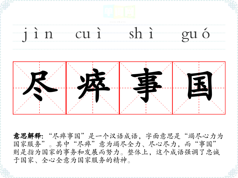 - 文学引用:古代文人常以“尽瘁事国”自励,表达对国家的忠诚。