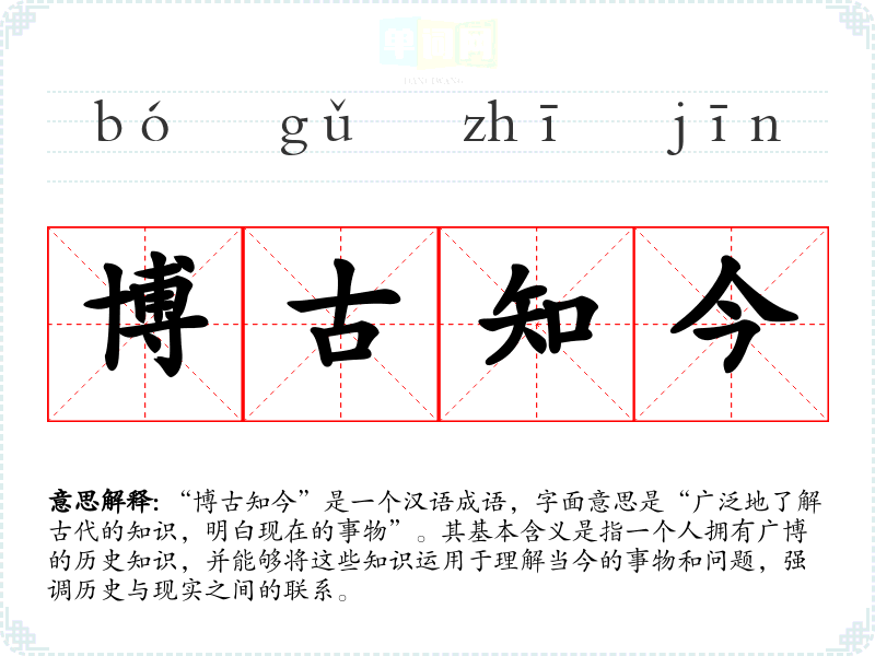 “博古知今”是一个汉语成语,字面意思是“广泛地了解古代的知识,明白现在的事物”。其基本含义是指一个人拥有广博的历史知识,并能够将这些知识运用于理解当今的事物和问题,强调历史与现实之间的联系。