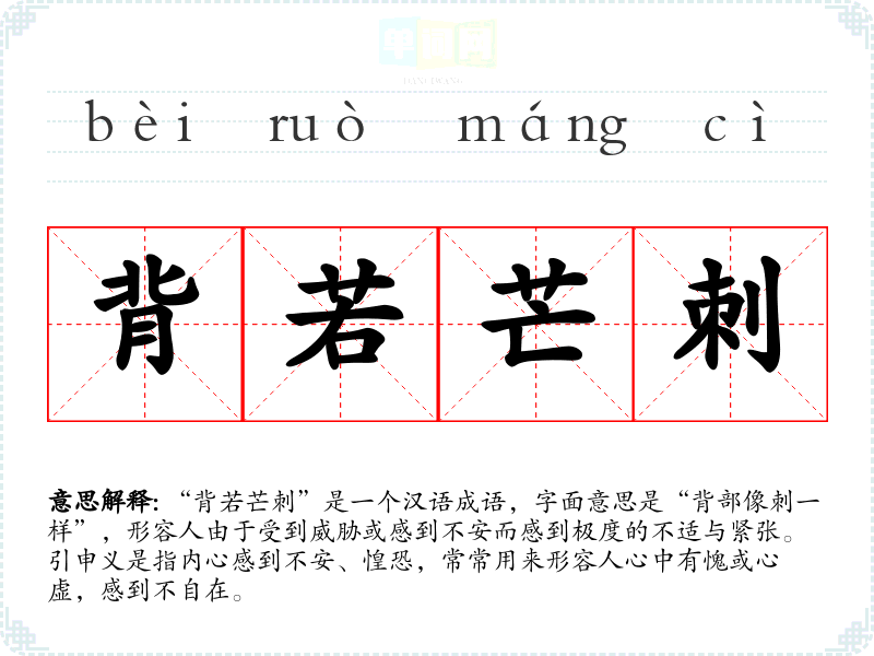 “背若芒刺”是一个汉语成语,字面意思是“背部像刺一样”,形容人由于受到威胁或感到不安而感到极度的不适与紧张。引申义是指内心感到不安、惶恐,常常用来形容人心中有愧或心虚,感到不自在。