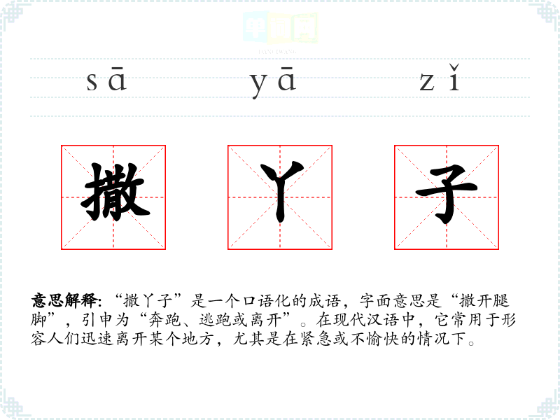 “撒丫子”是一个口语化的成语,字面意思是“撒开腿脚”,引申为“奔跑、逃跑或离开”。在现代汉语中,它常用于形容人们迅速离开某个地方,尤其是在紧急或不愉快的情况下。
