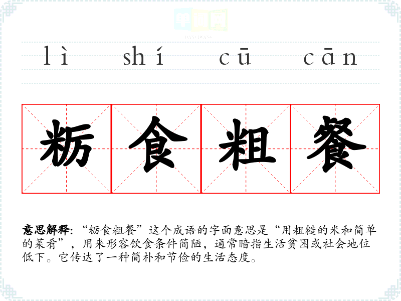 “粝食粗餐”这个成语的字面意思是“用粗糙的米和简单的菜肴”,用来形容饮食条件简陋,通常暗指生活贫困或社会地位低下。它传达了一种简朴和节俭的生活态度。