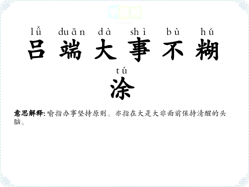 | 吕端大事不糊涂 | 喻指办事坚持原则。亦指在大是大非面前保持清醒的头脑。 |
