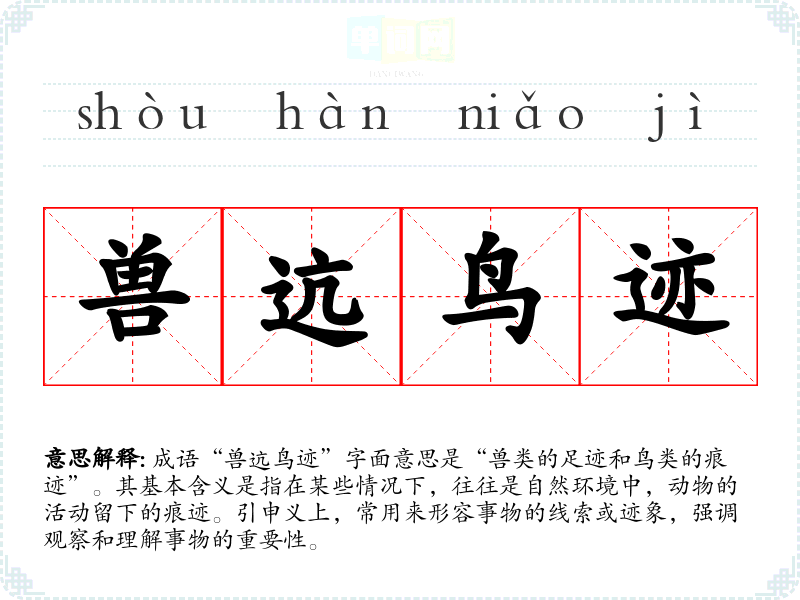 成语“兽迒鸟迹”字面意思是“兽类的足迹和鸟类的痕迹”。其基本含义是指在某些情况下,往往是自然环境中,动物的活动留下的痕迹。引申义上,常用来形容事物的线索或迹象,强调观察和理解事物的重要性。