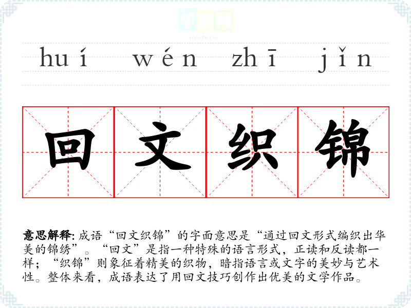 成语“回文织锦”的字面意思是“通过回文形式编织出华美的锦绣”。“回文”是指一种特殊的语言形式,正读和反读都一样;“织锦”则象征着精美的织物,暗指语言或文字的美妙与艺术性。整体来看,成语表达了用回文技巧创作出优美的文学作品。