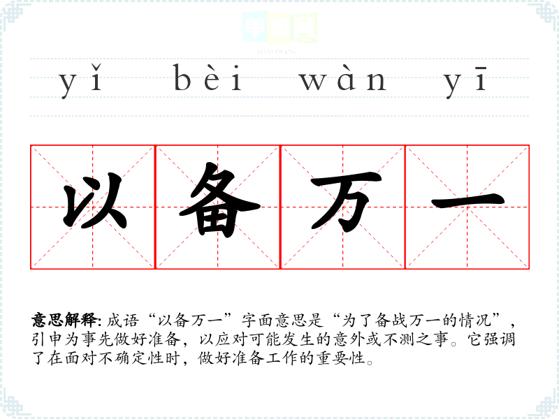 成语“以备万一”字面意思是“为了备战万一的情况”,引申为事先做好准备,以应对可能发生的意外或不测之事。它强调了在面对不确定性时,做好准备工作的重要性。