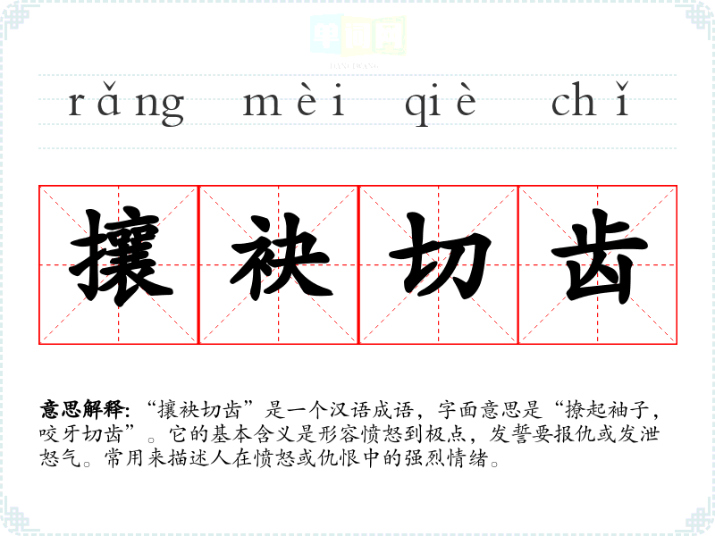 “攘袂切齿”是一个汉语成语,字面意思是“撩起袖子,咬牙切齿”。它的基本含义是形容愤怒到极点,发誓要报仇或发泄怒气。常用来描述人在愤怒或仇恨中的强烈情绪。
