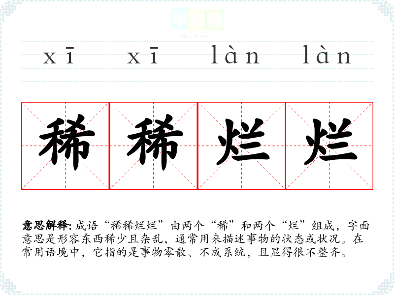 成语“稀稀烂烂”由两个“稀”和两个“烂”组成,字面意思是形容东西稀少且杂乱,通常用来描述事物的状态或状况。在常用语境中,它指的是事物零散、不成系统,且显得很不整齐。