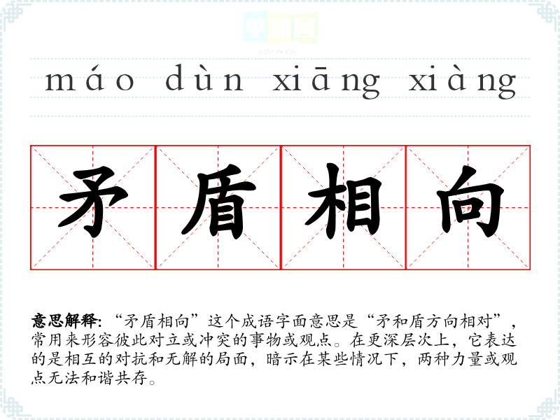 “矛盾相向”这个成语字面意思是“矛和盾方向相对”,常用来形容彼此对立或冲突的事物或观点。在更深层次上,它表达的是相互的对抗和无解的局面,暗示在某些情况下,两种力量或观点无法和谐共存。