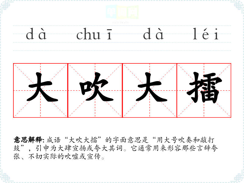 成语“大吹大擂”的字面意思是“用大号吹奏和敲打鼓”,引申为大肆宣扬或夸大其词。它通常用来形容那些言辞夸张、不切实际的吹嘘或宣传。