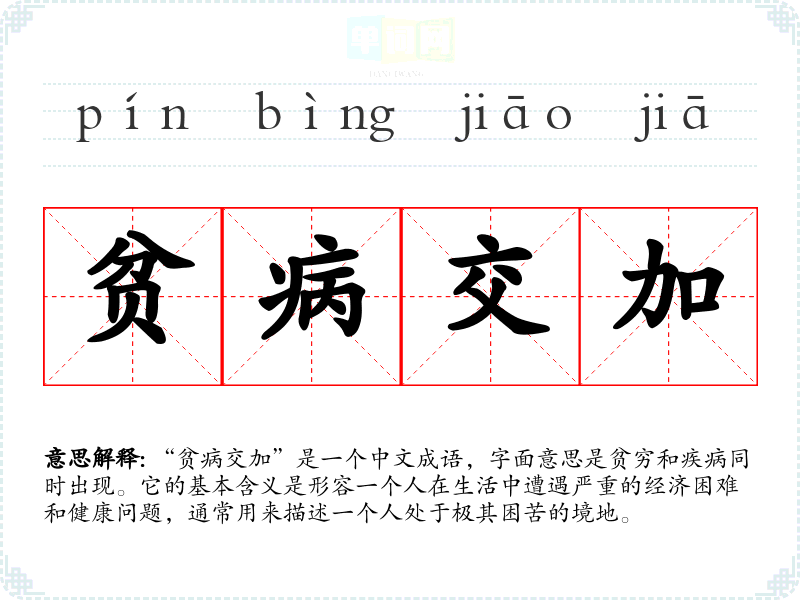 “贫病交加”是一个中文成语,字面意思是贫穷和疾病同时出现。它的基本含义是形容一个人在生活中遭遇严重的经济困难和健康问题,通常用来描述一个人处于极其困苦的境地。
