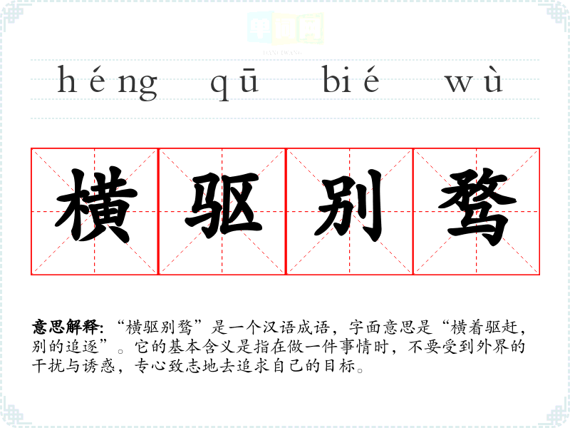 “横驱别骛”是一个汉语成语,字面意思是“横着驱赶,别的追逐”。它的基本含义是指在做一件事情时,不要受到外界的干扰与诱惑,专心致志地去追求自己的目标。