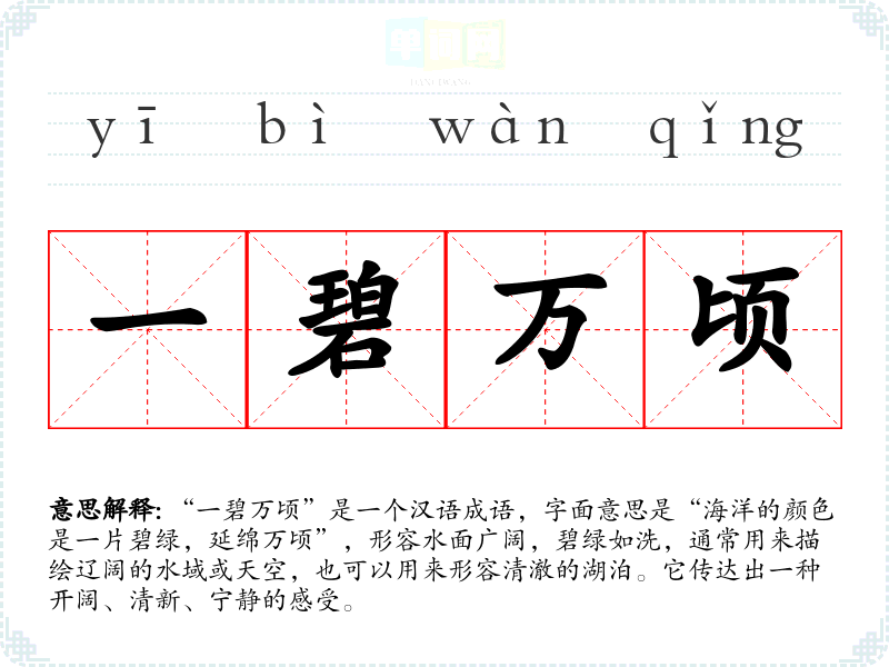 “一碧万顷”是一个汉语成语,字面意思是“海洋的颜色是一片碧绿,延绵万顷”,形容水面广阔,碧绿如洗,通常用来描绘辽阔的水域或天空,也可以用来形容清澈的湖泊。它传达出一种开阔、清新、宁静的感受。