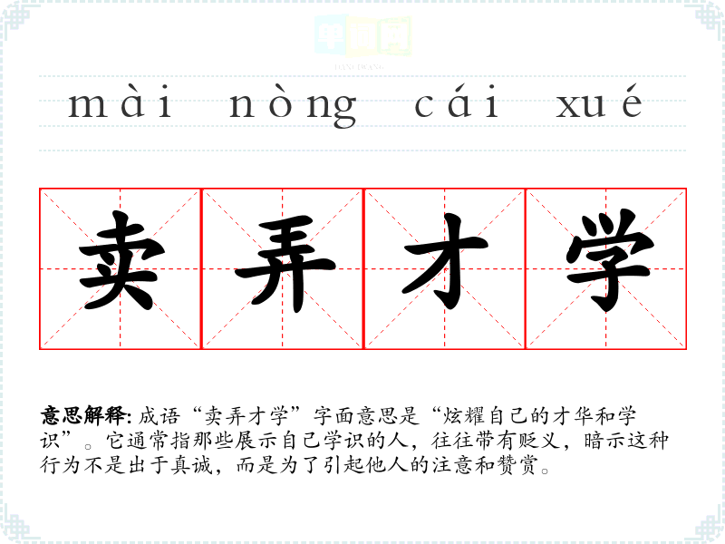 “卖弄才学”的具体来源并不明确,但可以理解为对古代文人或学者的一种描述。在古代,知识和才学被视为重要的社会资本,许多人可能通过炫耀自己的学识来获取地位或影响力。因此,该成语反映了一种对过度展示才华行为的批评。