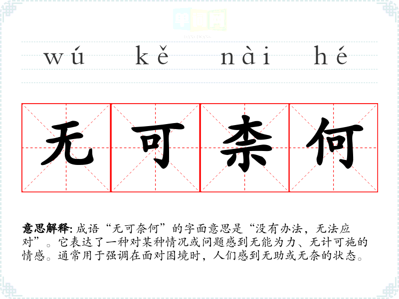 成语“无可奈何”的字面意思是“没有办法,无法应对”。它表达了一种对某种情况或问题感到无能为力、无计可施的情感。通常用于强调在面对困境时,人们感到无助或无奈的状态。