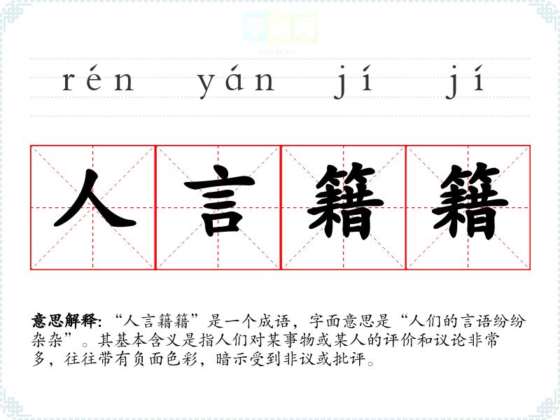 “人言籍籍”是一个成语,字面意思是“人们的言语纷纷杂杂”。其基本含义是指人们对某事物或某人的评价和议论非常多,往往带有负面色彩,暗示受到非议或批评。