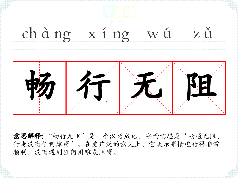 “畅行无阻”是一个汉语成语,字面意思是“畅通无阻,行走没有任何障碍”。在更广泛的意义上,它表示事情进行得非常顺利,没有遇到任何困难或阻碍。