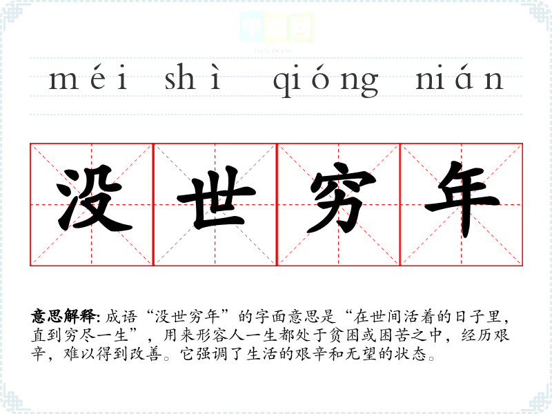 成语“没世穷年”的字面意思是“在世间活着的日子里,直到穷尽一生”,用来形容人一生都处于贫困或困苦之中,经历艰辛,难以得到改善。它强调了生活的艰辛和无望的状态。