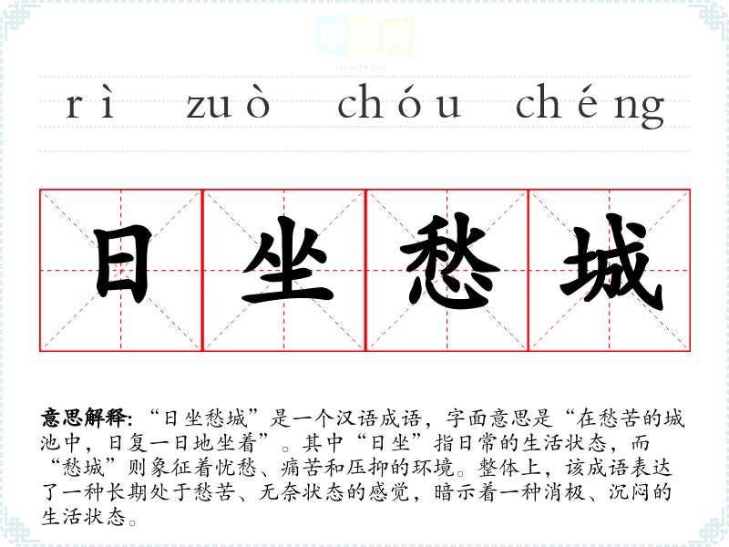 “日坐愁城”是一个汉语成语,字面意思是“在愁苦的城池中,日复一日地坐着”。其中“日坐”指日常的生活状态,而“愁城”则象征着忧愁、痛苦和压抑的环境。整体上,该成语表达了一种长期处于愁苦、无奈状态的感觉,暗示着一种消极、沉闷的生活状态。