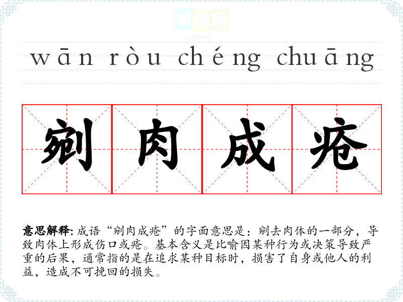 成语“剜肉成疮”的字面意思是:剜去肉体的一部分,导致肉体上形成伤口或疮。基本含义是比喻因某种行为或决策导致严重的后果,通常指的是在追求某种目标时,损害了自身或他人的利益,造成不可挽回的损失。