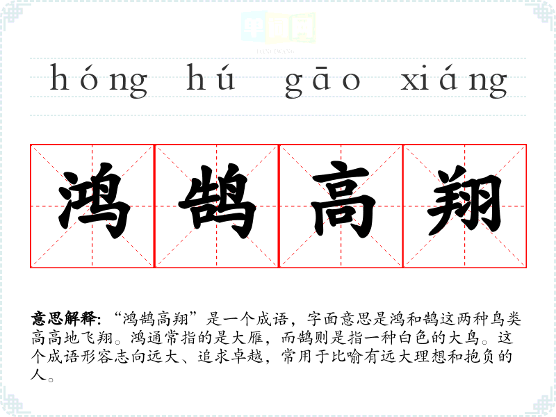 | 鸿鹄高翔 | 鸿鹄:天鹅。像天鹅那样飞得又高又远。比喻人的志向远大。 |