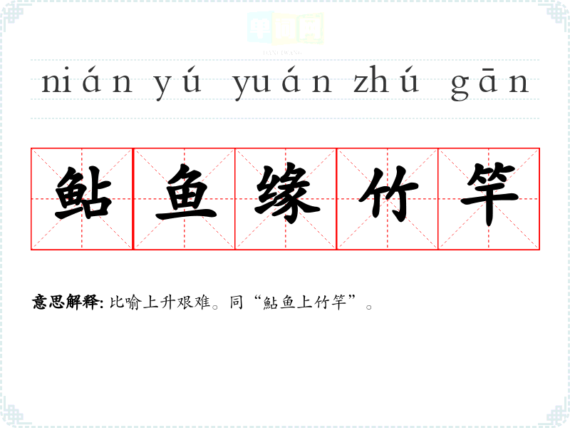 | 鲇鱼缘竹竿 | 比喻上升艰难。同“鮎鱼上竹竿”。 |